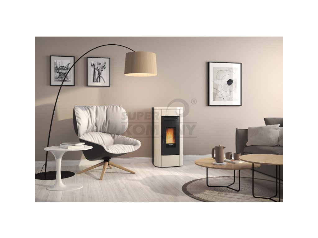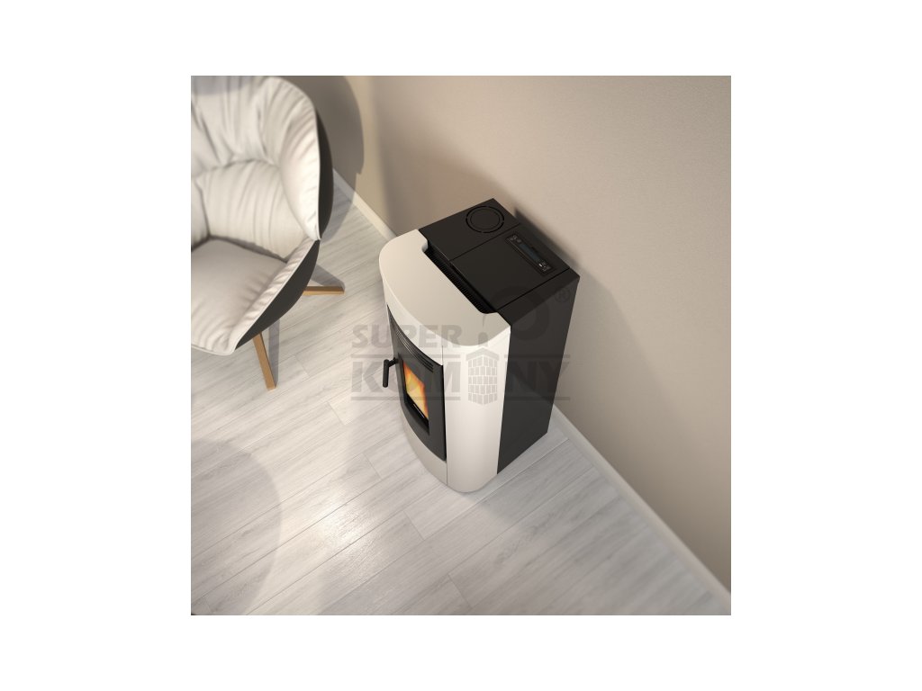 Lokální teplovzdušná kamna na pelety s automaticky regulovatelným výkonem a možností rozvodu teplého vzduchu do dalších místností. Ocelové opláštění má smaltovanou povrchovou úpravu v různých barevných odstínech. Tím je zaručena barevná i tvarová stálost obkladu. V horní části jsou kamna osazena kachlovým obkladem. Topeniště je osazeno litinovými dvířky s velkým panoramatickým prosklením. Předávání tepla je podpořeno distribučním ventilátorem, který lze modulovat pomocí integrované funkce. Tím je zaručena lepší cirkulace a rovnoměrnost tepla po místnosti a možnost rozptýlení tepla i do přilehlých místností. Litinová konstrukce spalovací komory zaručuje dlouhodobou životnost. Zásobník má kapacitu na 15 kg pelet a spotřeba paliva je od 0,7 do 1,8 kg / hod. Účinnost kamen převyšuje hranici 90 %. Součástí konstrukce je integrovaný termostat pro kontrolu a udržování nastavené teploty. Podle nastavené teploty uživatelem na displeji si kamna automaticky upravují množství přikládaných pelet a tím i samotný výkon kamen. Možnost nastavení týdenního programování zvyšuje komfort a umožňuje automatické zapínání a vypínání kamen i v případě nepřítomnosti obsluhy. Tím odpadá práce s přípravou palivového dřeva a zákazníkům je poskytnut komfortní a plně automatický provoz. Kamna se nabízí v různém barevném provedení obkladu. V ceně kamen je dálkový ovladač, který zvyšuje komfort obsluhy.