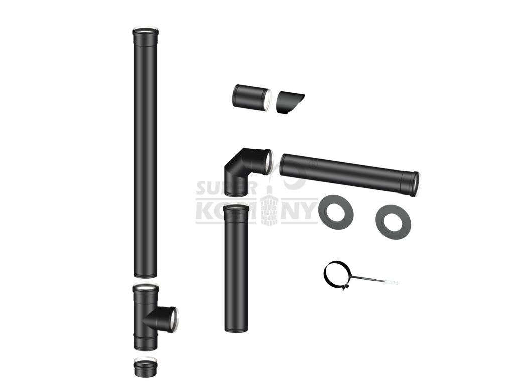 Sada obsahuje nerezové roury, povrchová úprava černý komaxit, vnitřní průměr 80 mm a je přímo určena k odvodu spalin pro peletová kamna.