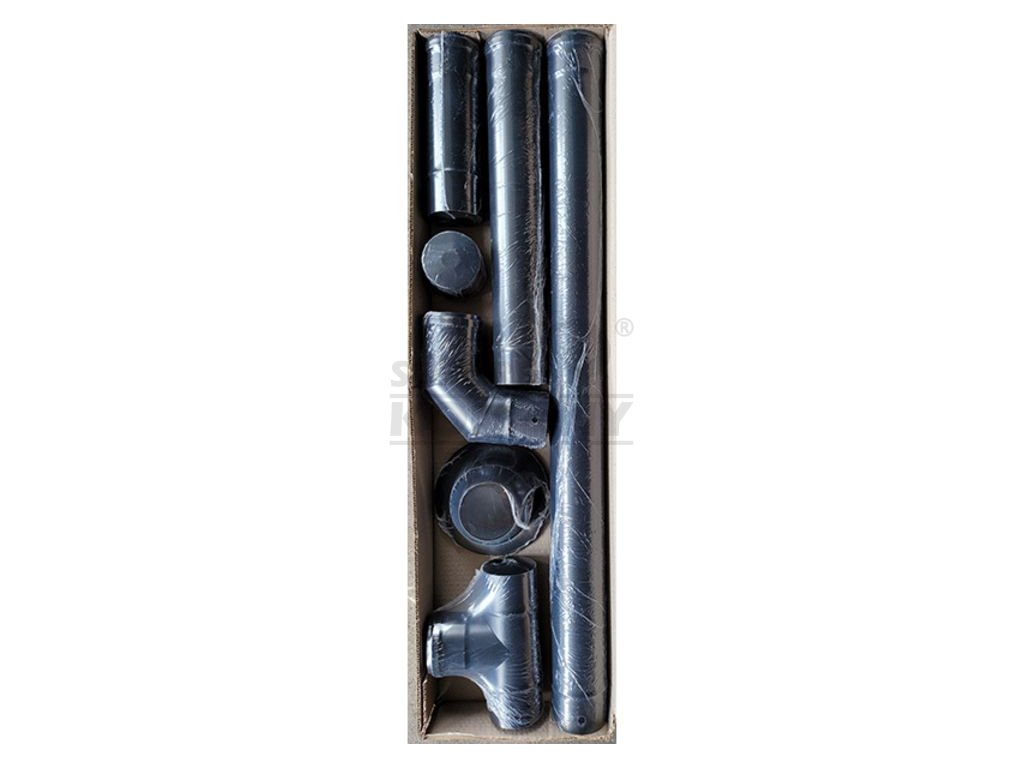 Set obsahuje 3 roury kouřovodu (délky 0,25 m, 0,5 m a 1 m), dále koleno kouřovodu, T- kus, kondazační nádobu a růžici pro kouřovod.