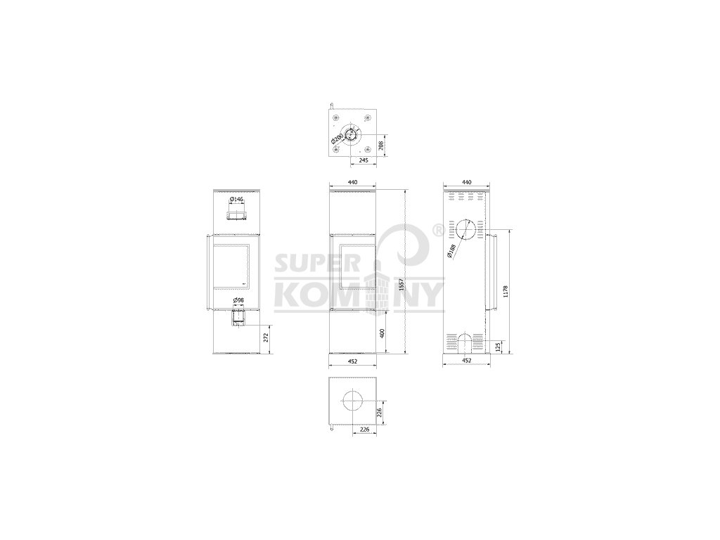 - Přívod vzduchu externím hrdlem (fi 100), připojitelným zezadu i zespodu