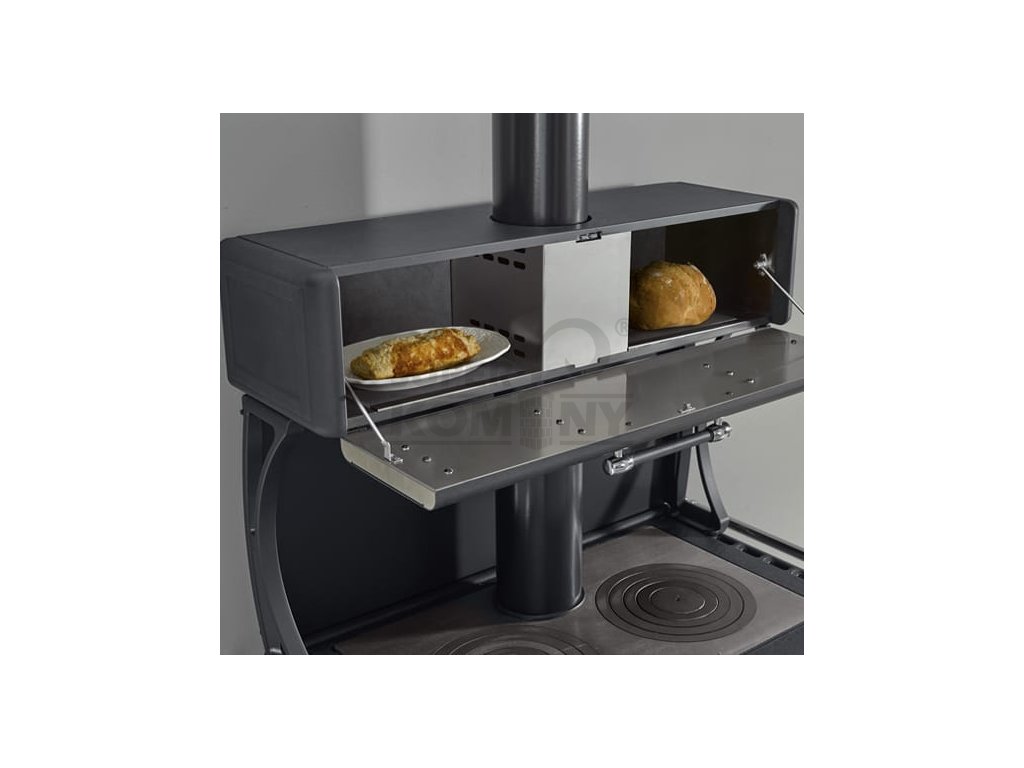 Sporák je vybaven ohřívací přihrádkou nad plotnu, pro ještě větší využití tepla při topení. Přihrádka je vyložena masivními přírodními kameny pro akumulaci tepla. Může tak sloužit k ohřevu pokrmů, sušení, dopékání nebo předehřívání talířů. Sporák je také možné zakoupit v základní verzi bez ohřívací přihrádky. (Milly)