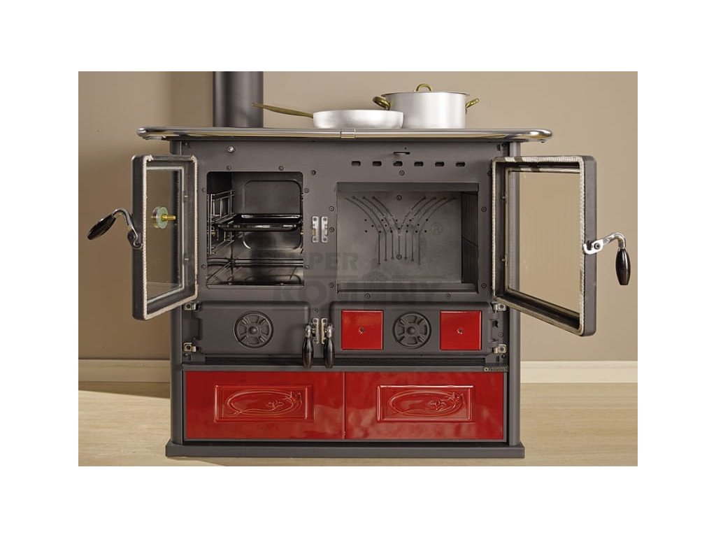 Kvalitní litinový sporák na topení dřevem a dřevěnými briketami s velikým proskleným ohništěm a kachlovým obkladem. Velice populární sporák nejen na chaty a chalupy, kde se využije především na topení, ale i smaltovaná trouba na příležitostné pečení a velká litinová plotna na vaření. Jako jeden z mála sporáků na trhu, umožňuje v zadní části napojení na externí přívod vzduchu a nečerpá tak vzduch pro hoření z místnosti.