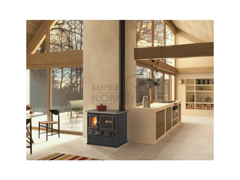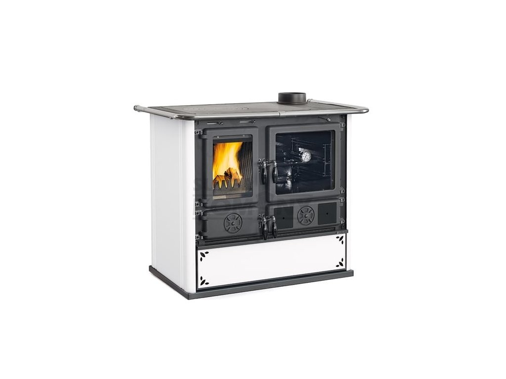 Kvalitní litinový sporák na topení dřevem a dřevěnými briketami s proskleným ohništěm a smaltovaným ocelovým obkladem. Velice populární sporák nejen na chaty a chalupy, kde se využije na topení, ale i smaltovaná trouba na pečení a velká litinová plotna na vaření.