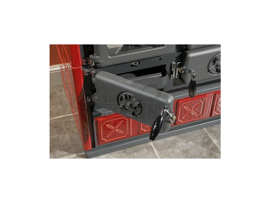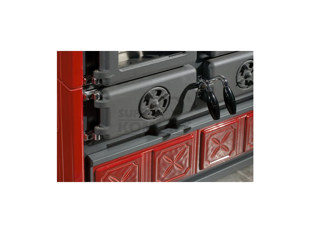 Vývod pro napojení kouřovodu je napravo a může být nahoru nebo dozadu. Kachlové boky sporáku tlumí sálavé teplo a snižují povrchovou teplotu, čímž šetří místo a brání možnosti popálení při náhlém dotyku. Kolem celé plotny je chromované madlo, které sporák zdobí a zároveň se dá využít pro odkládání a sušení utěrek nebo také pro zavěšení krbového nářadí.