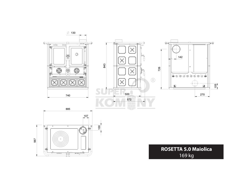 Kachlový obklad dodává sporáku krásný vzhled a slouží jako solitérní doplněk interiéru. Konstrukce topeniště je masivní celo-litinová a veškeré ocelové díly jsou smaltované z obou stran nebo pozinkované, což zaručuje dlouhodobou životnost sporáku. Veškerá dvířka jsou také z masivní litiny. Vypovídající údaj o masivní konstrukci je samotná hmotnost sporáku, která je 169 kg. Pečící trouba o objemu 28 litrů je oboustranně smaltovaná tudíž povrch je odolný proti propálení a snadno se udržuje. Ve dvířkách trouby je integrovaný teploměr pro rychlou a přesnou kontrolu teploty, který tak zaručuje pohodlné pečení. Litinová varná plotna je precizně zabroušena pro dokonalý převod tepla a zespodu masivně vyztužena pro dlouhodobou životnost. Sporák je vybaven mechanickou přepínací klapkou pro snadné a rychlé vyřazení pečící trouby z provozu, např. při letním vaření nebo při roztápění sporáku. Spaliny tak odchází z topeniště rovnou pod plotnou do komínu a nebo pod plotnou a kolem dokola celé pečící trouby a následně v zadní části do komínu. Regulace výkonu sporáku je pomocí dvou šoupátek pro primární a sekundární vzduch. Do topeniště je ještě nasáván prudce předehřátý terciální vzduch pro lepší prohoření paliva a nižší emise výstupních spalin. Pod roštem je snadno odnímatelný popelník. Prostor pod troubou může sloužit pro ohřívání, sušení, uchování teplých pokrmů nebo jen jako úložný prostor na plechy a rošty. Ve spodní části je výsuvný úložný prostor na dřevo nebo na příslušenství ke sporáku.