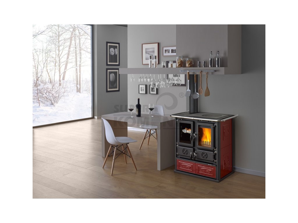 Kachlový obklad dodává sporáku krásný vzhled a slouží jako solitérní doplněk interiéru. Konstrukce topeniště je masivní celo-litinová a veškeré ocelové díly jsou smaltované z obou stran nebo pozinkované, což zaručuje dlouhodobou životnost sporáku. Veškerá dvířka jsou také z masivní litiny. Vypovídající údaj o masivní konstrukci je samotná hmotnost sporáku. Pečící trouba o objemu 28 litrů je oboustranně smaltovaná tudíž povrch je odolný proti propálení a snadno se udržuje. Ve dvířkách trouby je integrovaný teploměr pro rychlou a přesnou kontrolu teploty, který tak zaručuje pohodlné pečení. Litinová varná plotna je precizně zabroušena pro dokonalý převod tepla a zespodu masivně vyztužena pro dlouhodobou životnost. Sporák je vybaven mechanickou přepínací klapkou pro snadné a rychlé vyřazení pečící trouby z provozu, např. při letním vaření nebo při roztápění sporáku. Spaliny tak odchází z topeniště rovnou pod plotnou do komínu a nebo pod plotnou a kolem dokola celé pečící trouby a následně v zadní části do komínu. Regulace výkonu sporáku je pomocí dvou šoupátek pro primární a sekundární vzduch. Do topeniště je ještě nasáván prudce předehřátý terciální vzduch pro lepší prohoření paliva a nižší emise výstupních spalin. Pod roštem je snadno odnímatelný popelník. Prostor pod troubou může sloužit pro ohřívání, sušení, uchování teplých pokrmů nebo jen jako úložný prostor na plechy a rošty. Ve spodní části je výsuvný úložný prostor na dřevo nebo na příslušenství ke sporáku.