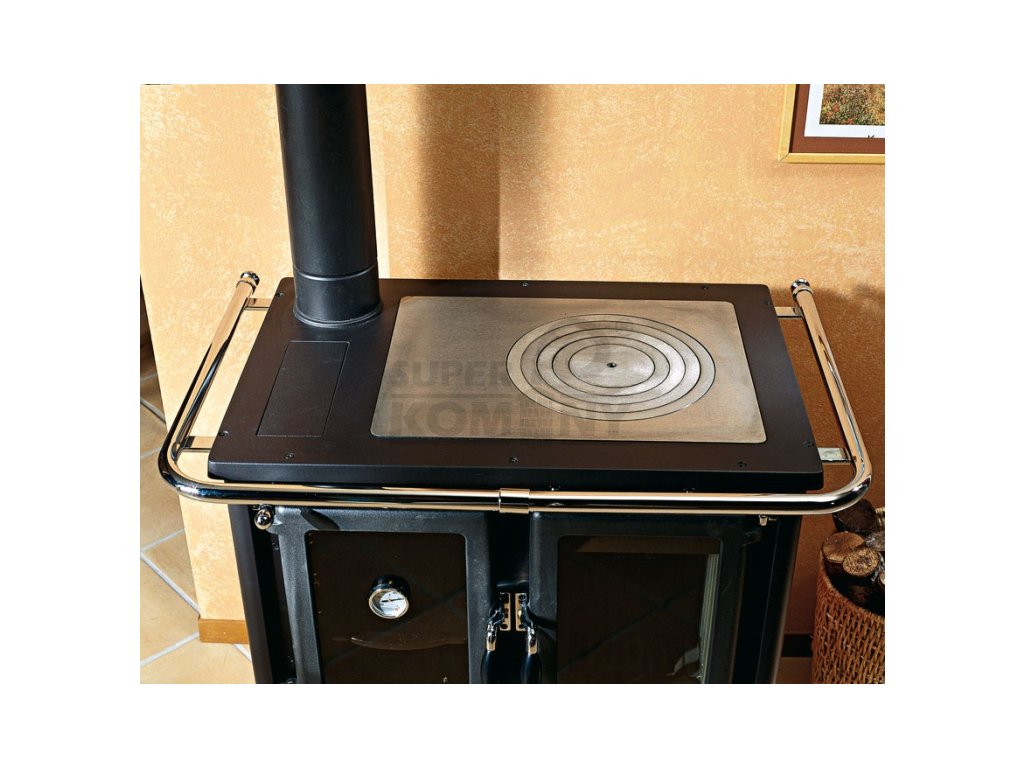 Kvalitní litinový sporák na topení dřevem a dřevěnými briketami s proskleným ohništěm a kachlovým obkladem. Velice populární sporák nejen na chaty a chalupy, kde se využije na topení, ale i smaltovaná trouba na pečení a velká litinová plotna na vaření.