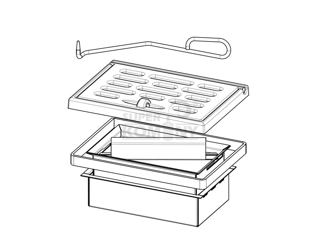 Inovovaná sestava roštu pro krbové vložky. Litinový rošt lze elegantně vyklápět pomocí přiloženého háčku. Popelník má tvar boxu s víkem pro snadné přenášení.